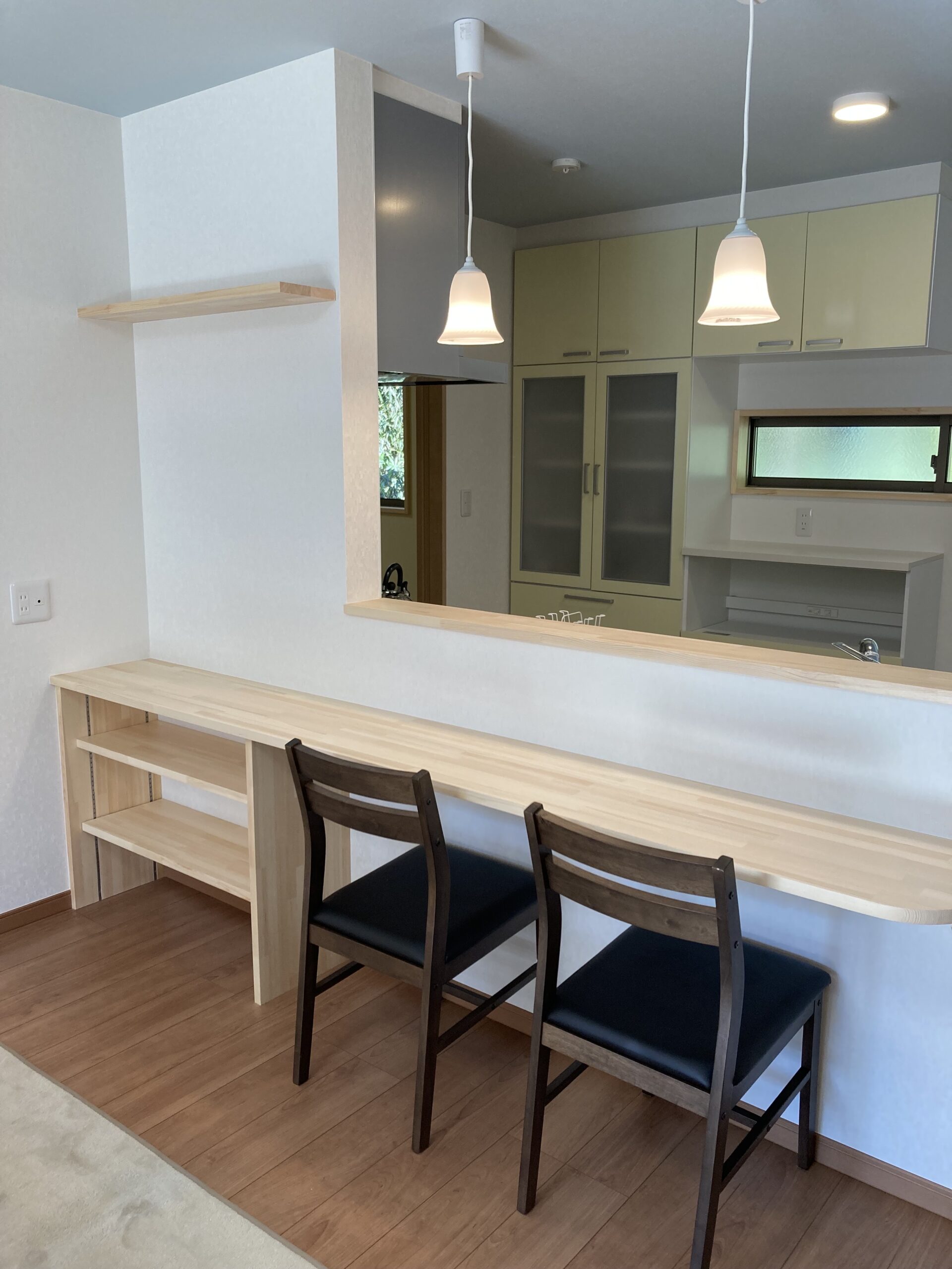 造作のカウンターテーブルでお料理を作りながらお子様の宿題を見る事もできちゃう。